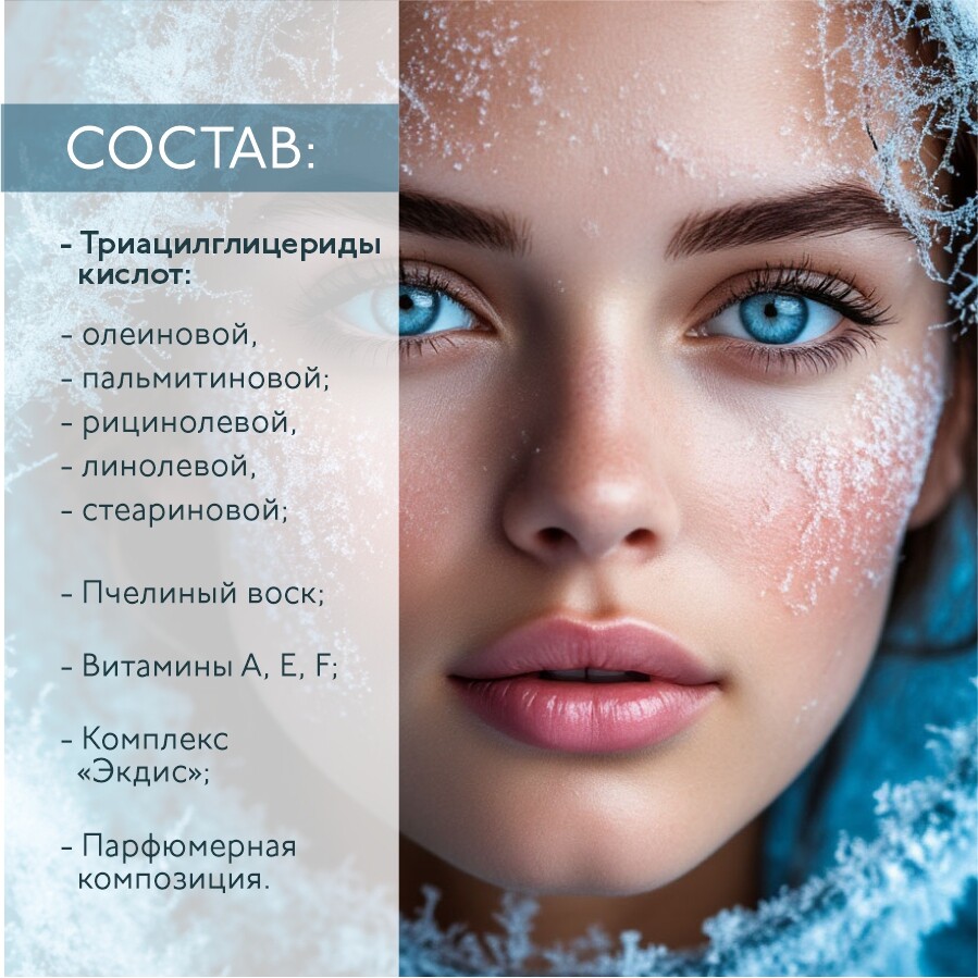 Триацилглицериды (олеиновой, пальмитиновой, рицинолевой, линолевой, стеариновой кислот), пчелиный воск, витамины А, Е, F, Экдис, парфюмерная композиция.