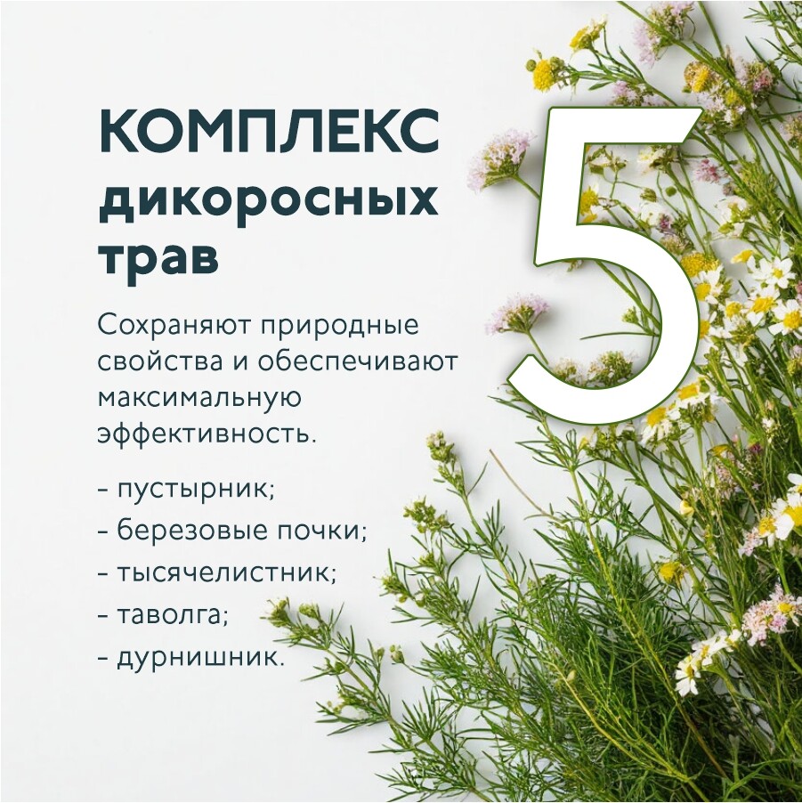 Особая рецептура включает комплекс из 5 дикорастущих трав, которые
