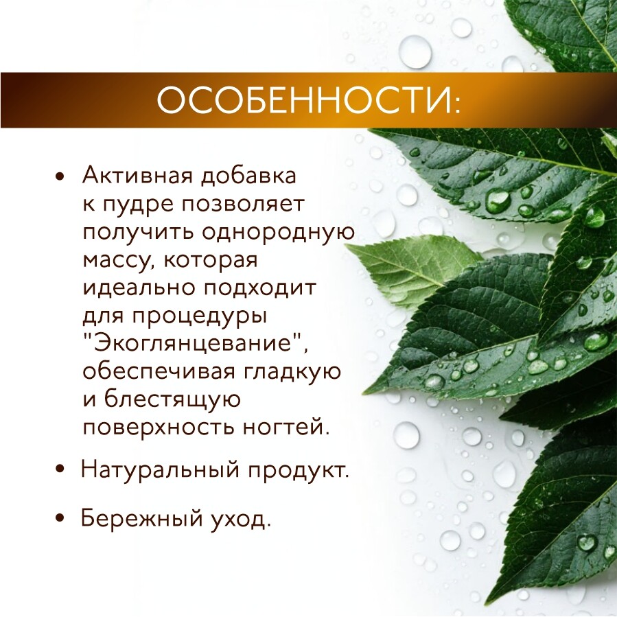 Активная добавка к пудре позволяет получить однородную массу, которая идеально подходит для процедуры "Экоглянцевание", обеспечивая гладкую и блестящую поверхность ногтей.