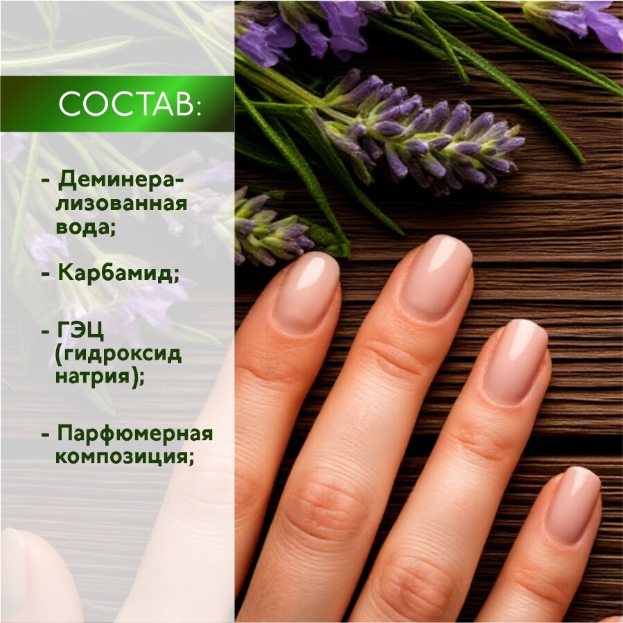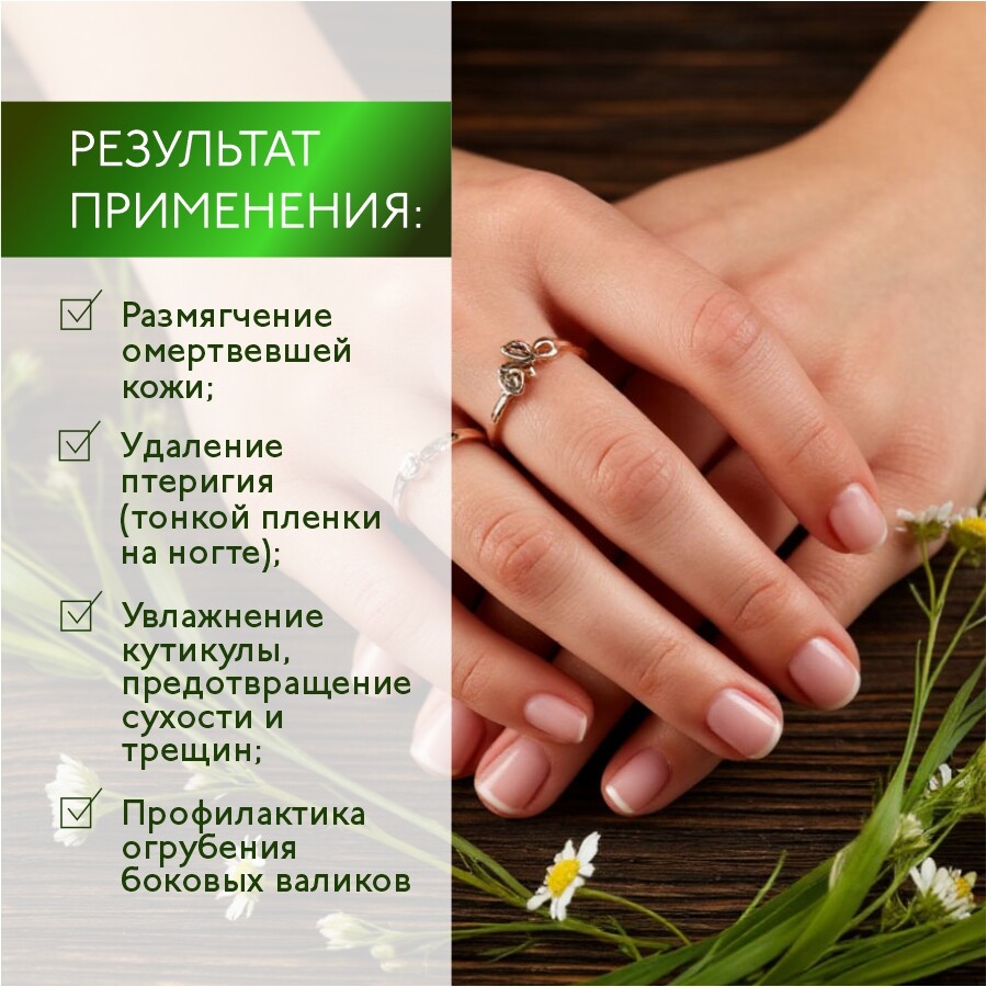 Средство мягко и быстро размягчает омертвевшие клетки кожи, облегчая их удаление и способствуя обновлению кожи вокруг ногтей.
