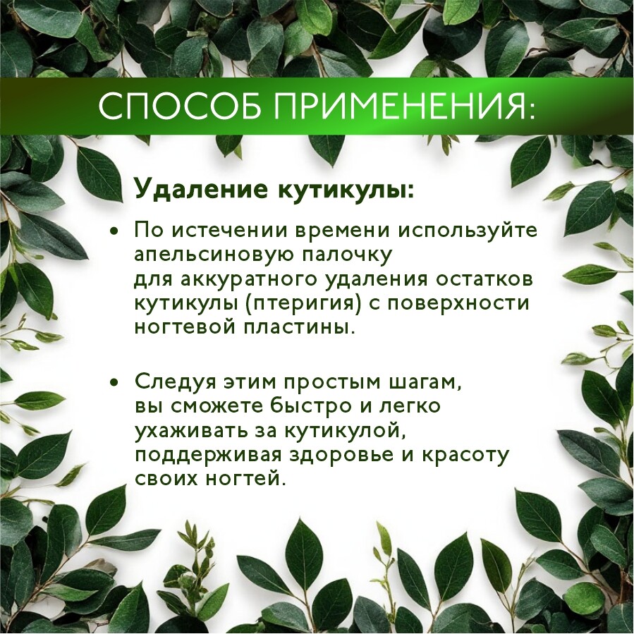 По истечении времени используйте апельсиновую палочку для аккуратного удаления остатков кутикулы (птеригия) с поверхности ногтевой пластины.