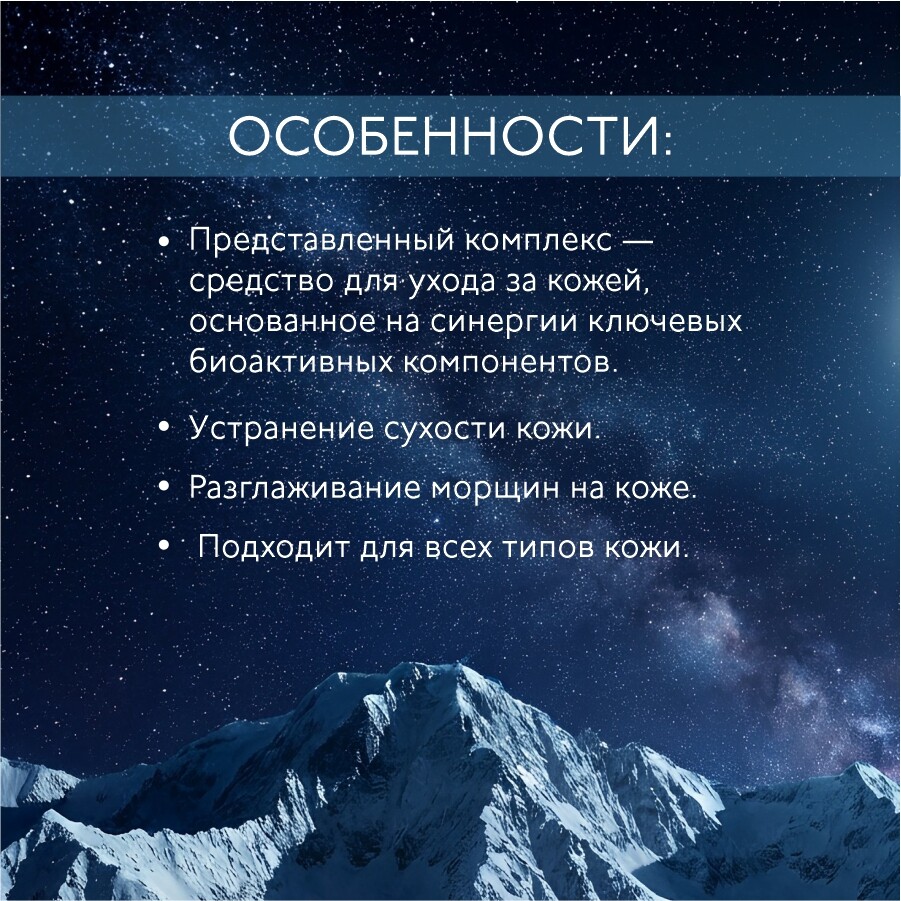 Представленный комплекс — средство для ухода за кожей, основанное на синергии ключевых биоактивных компонентов.