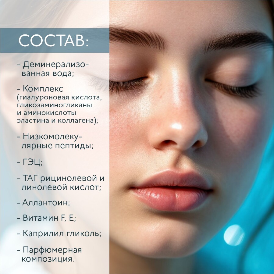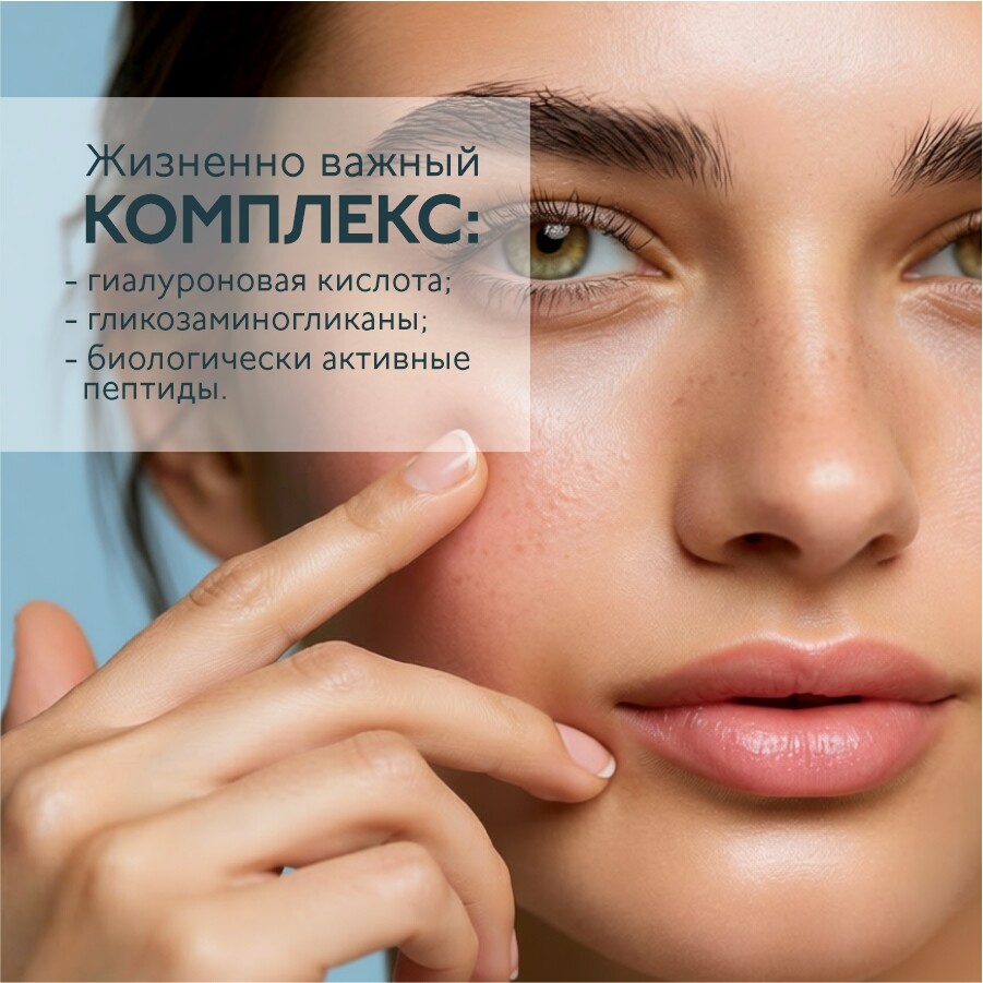 - сбалансированный комплекс гиалуроновой кислоты, гликозаминогликанов и аминокислот эластина и коллагена низкомолекулярные пептиды