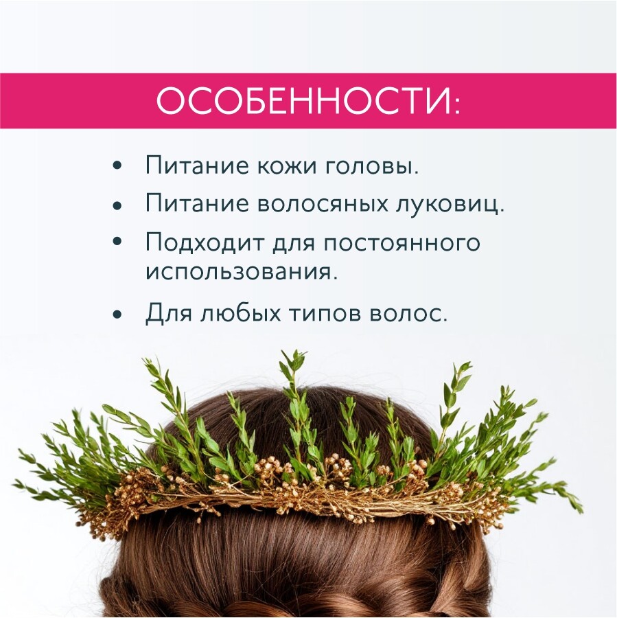 Интенсивно питает кожу головы и волосяные луковицы. Способствует быстрому росту и укреплению волос. Препятствует выпадению волос. Подходит для постоянного использования для любого типа волос.