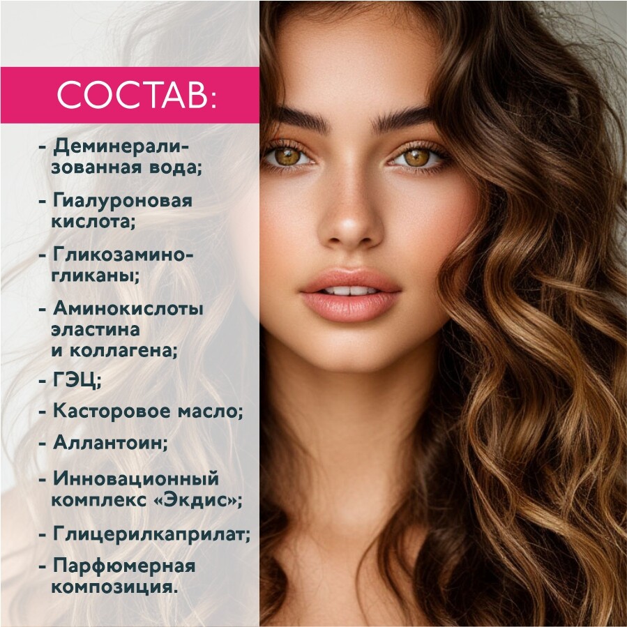Деминерализованная вода, гиалуроновая кислота, гликозаминогликаны, аминокислоты эластина и коллагена, гэц, касторовое масло, аллантоин, Экдис, глицерилкаприлат, парфюмерная композиция.