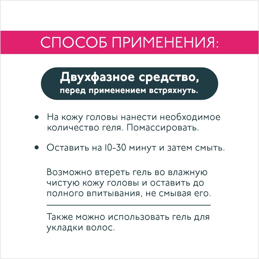 На кожу головы нанести необходимое количество геля, помассировать, оставить на 10-30 минут и затем смыть. Возможно втереть гель во влажную чистую кожу головы и оставить до полного впитывания не смывая его. Также можно использовать гель для укладки волос. Двухфазное средство, перед употреблением встряхнуть.