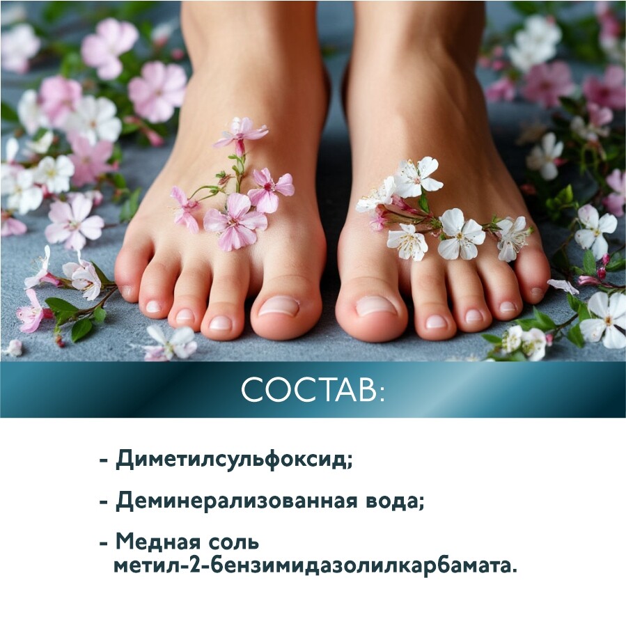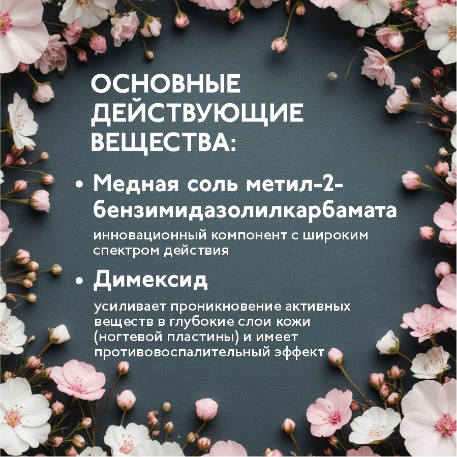Димексид - усиливает проникновение активных веществ в глубокие слои кожи (ногтевой пластины) и имеет противовоспалительный эффект.