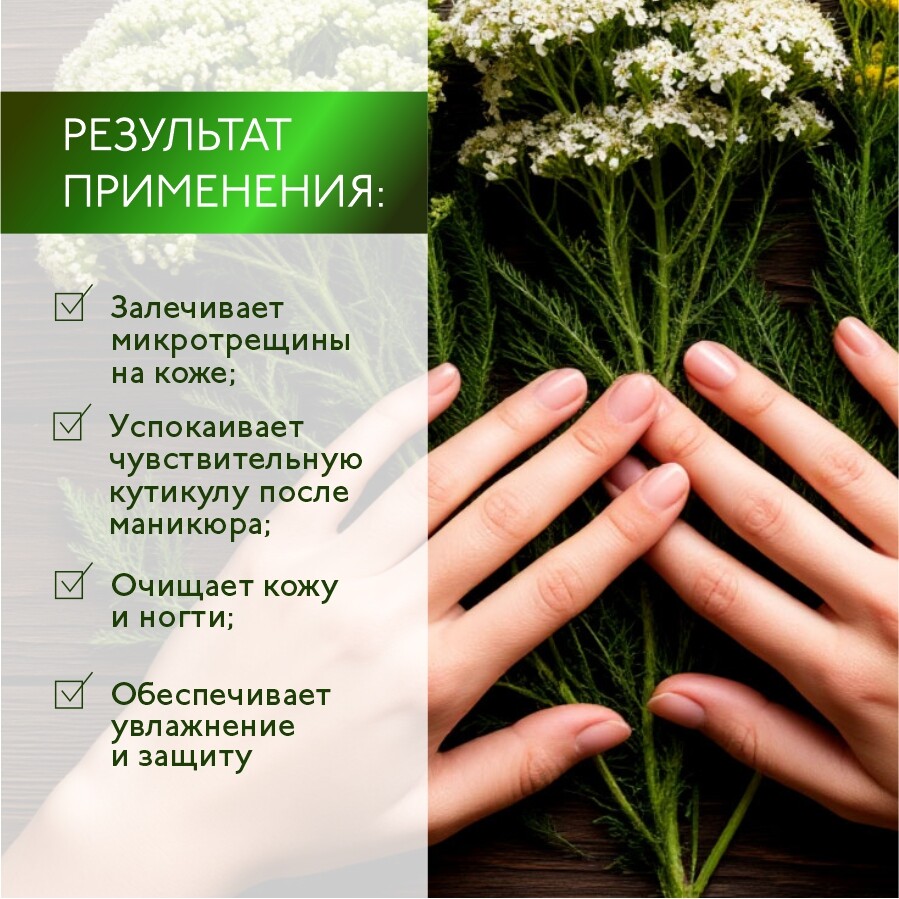 Залечивает микротрещины на коже и успокаивает чувствительную кутикулу после маникюра.