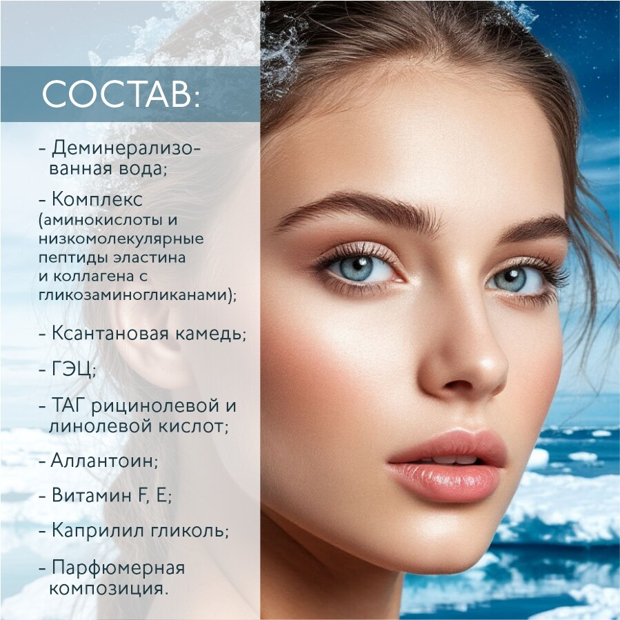 - сбалансированный комплекс аминокислот и низкомолекулярных пептидов эластина и коллагена с гликозаминогликанами