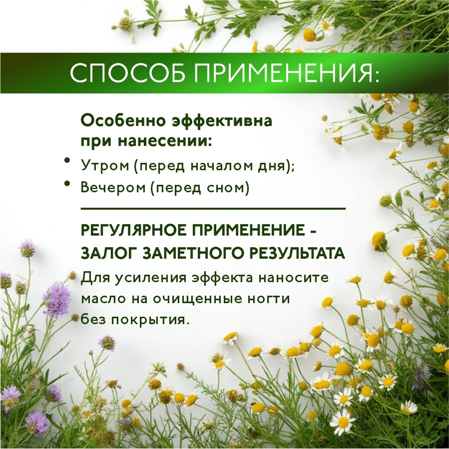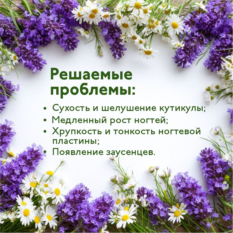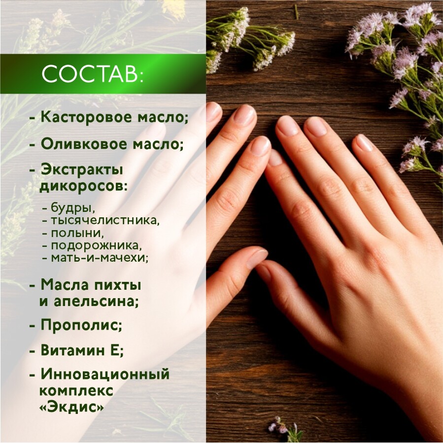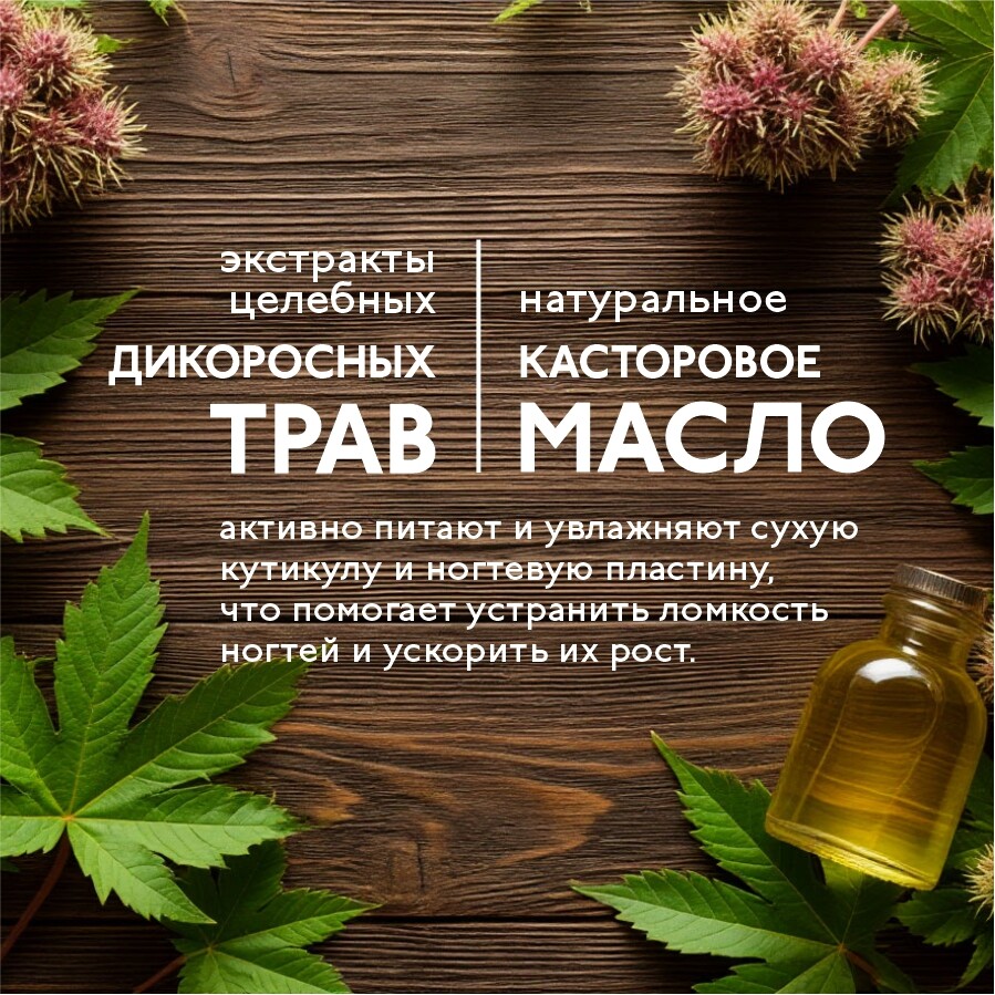 Экстракты целебных дикоросных трав и натуральное касторовое масло активно питают и увлажняют сухую кутикулу и ногтевую пластину, что помогает устранить ломкость ногтей и ускорить их рост.