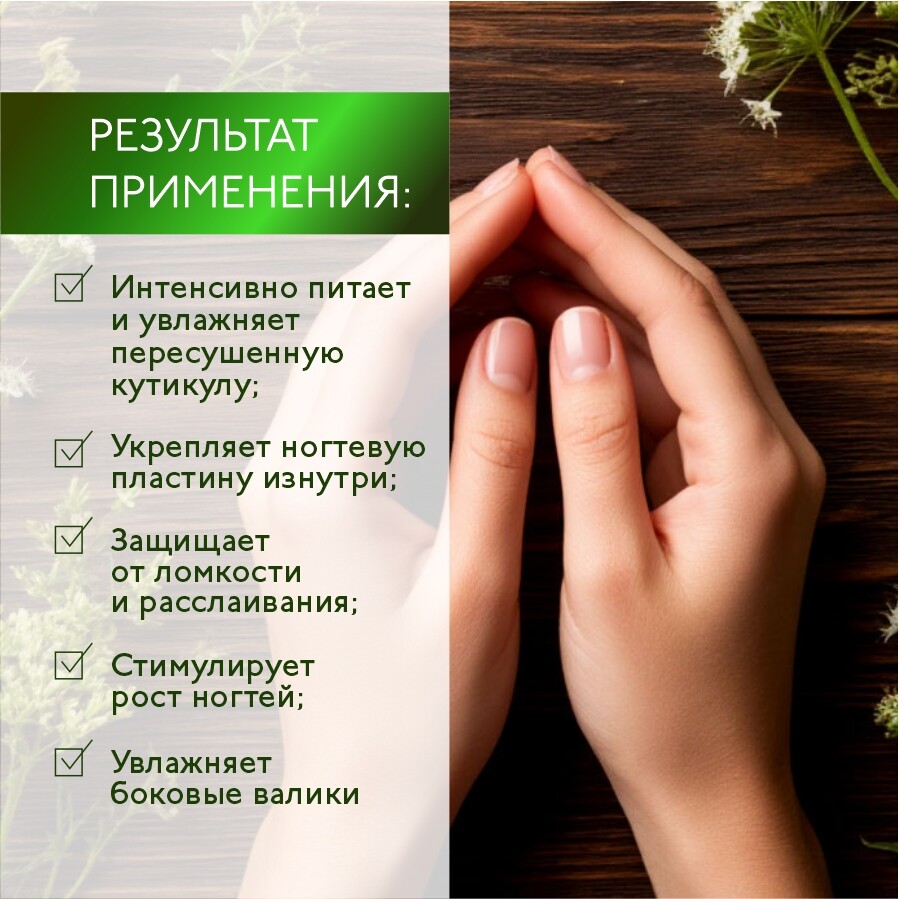 Активные компоненты проникают глубоко в структуру ногтя и кожу вокруг него, обеспечивая комплексный уход.