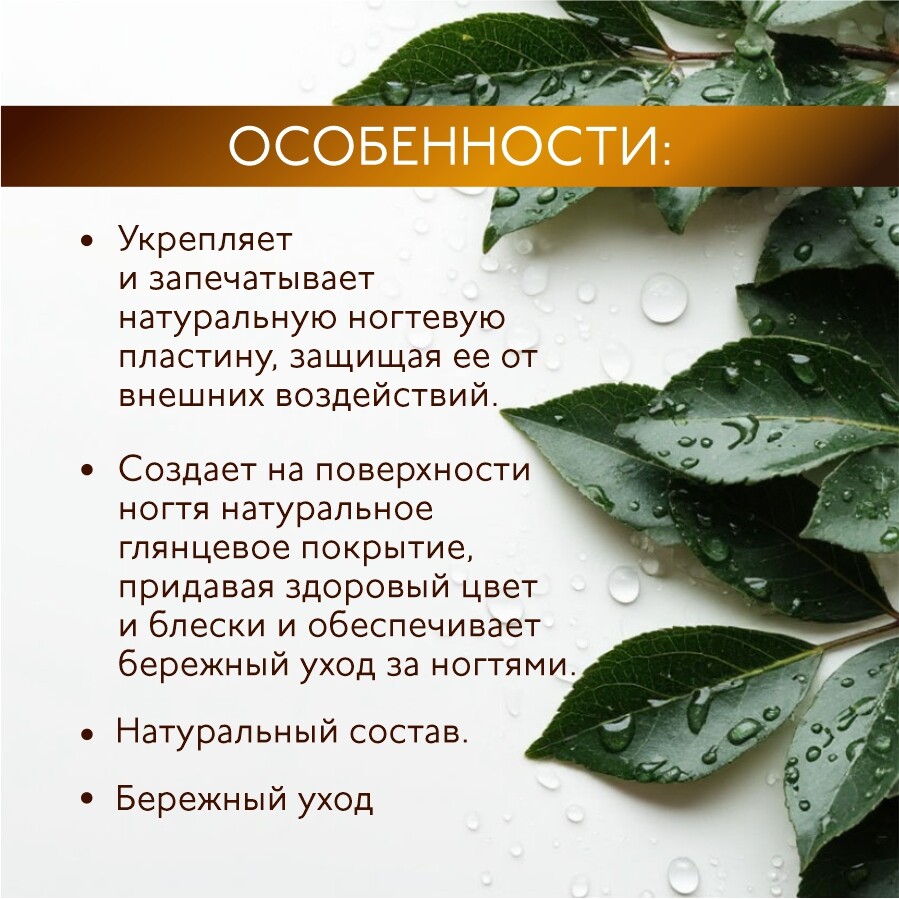 Создает на поверхности ногтя натуральное глянцевое покрытие, придавая здоровый цвет и блески и обеспечивает бережный уход за ногтями.