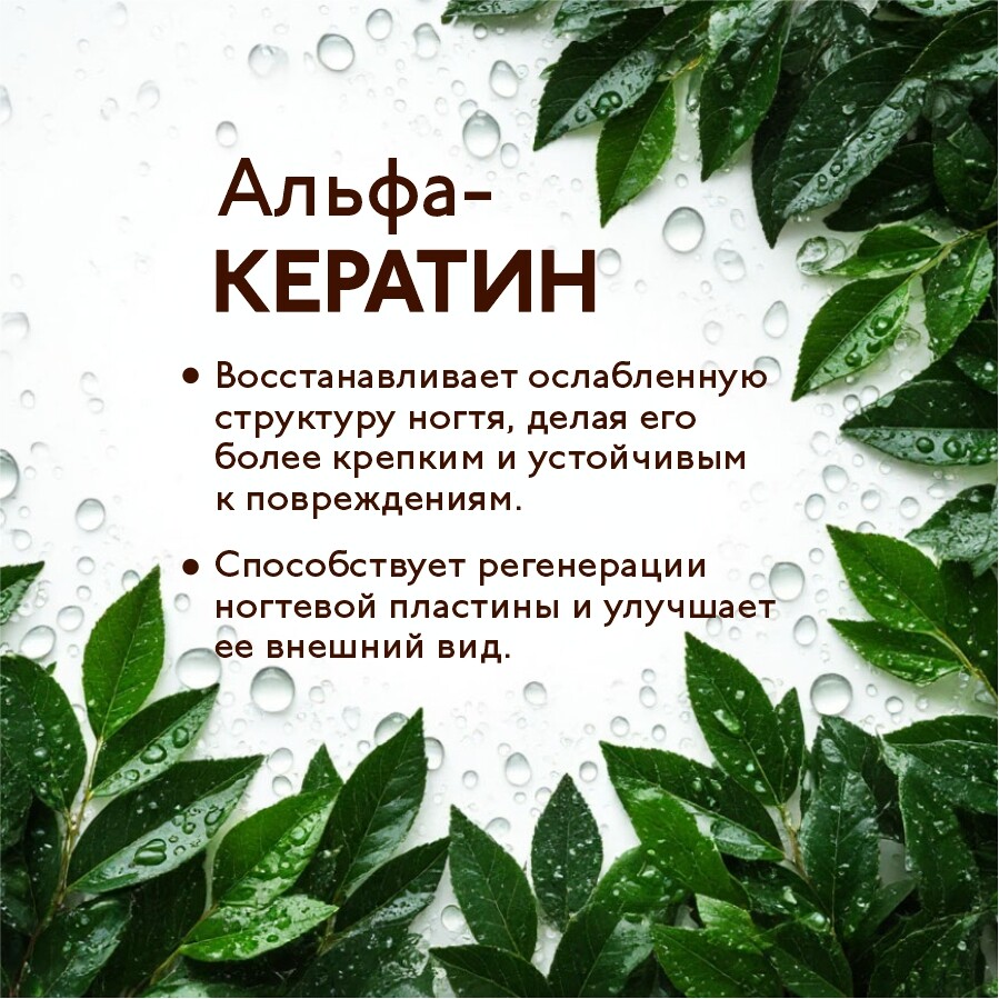 Альфа-кератин в составе помогает восстановить ослабленную структуру ногтя, делая его более крепким, а запечатывающий эффект защищает его от внешних воздействий.