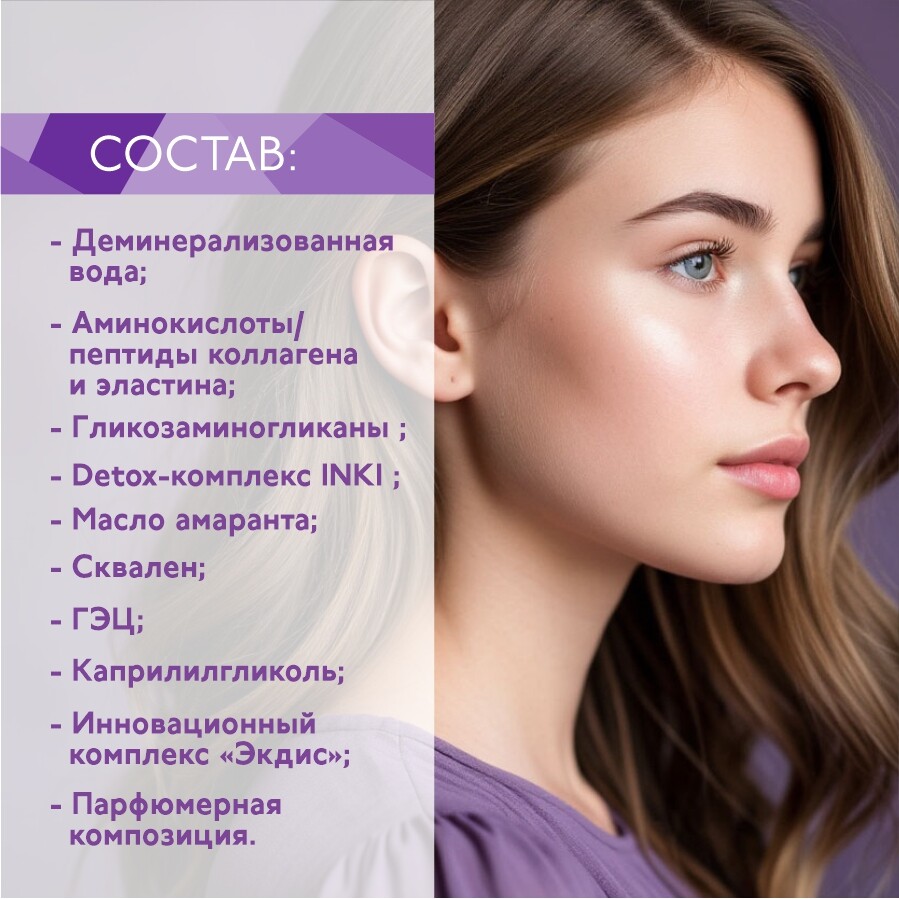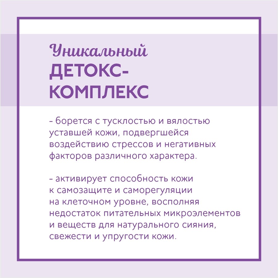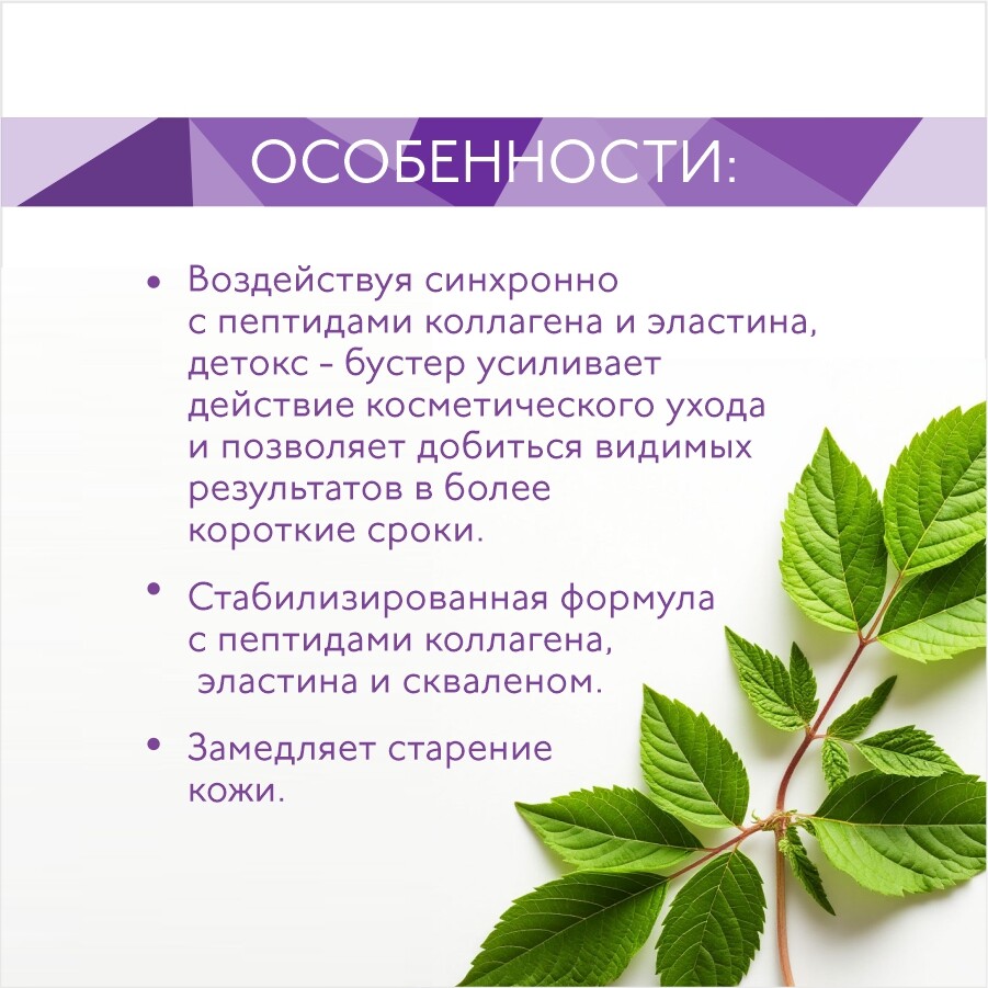 Воздействуя синхронно с пептидами коллагена и эластина, детокс - бустер усиливает действие косметического ухода и позволяет добиться видимых результатов в более короткие сроки.