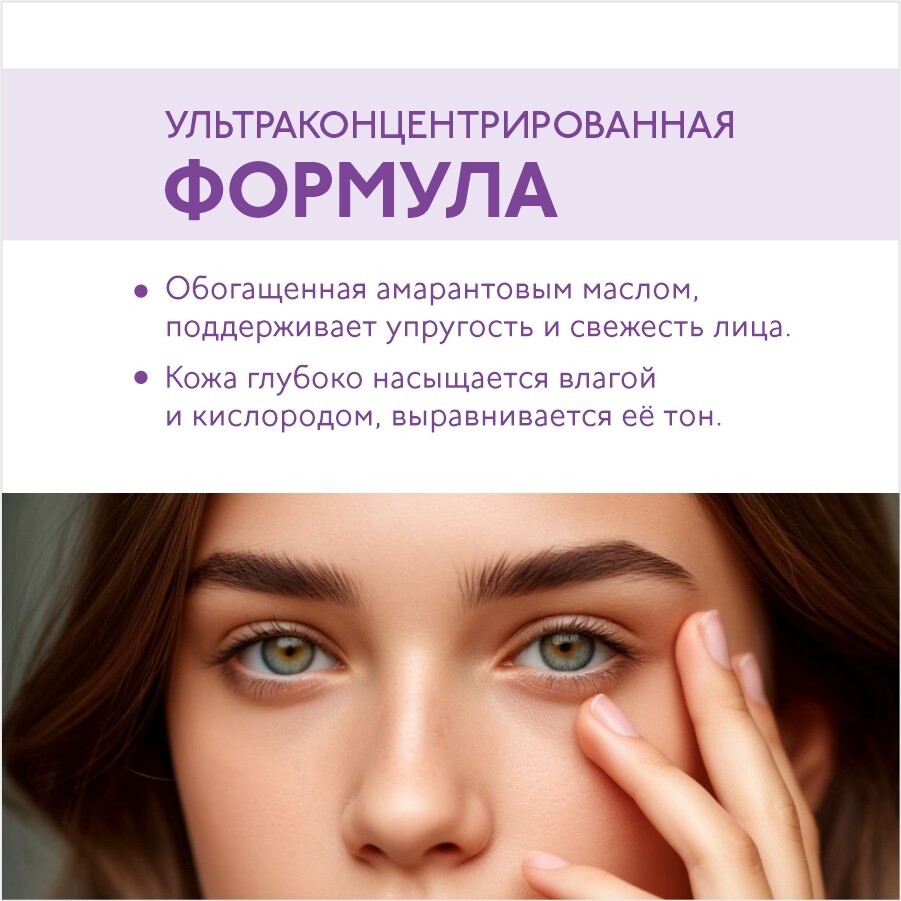 Ультраконцентрированная формула сыворотки-бустера, обогащенная амарантовым маслом, поддерживает упругость и свежесть лица. Кожа глубоко насыщается влагой и кислородом, выравнивается её тон.