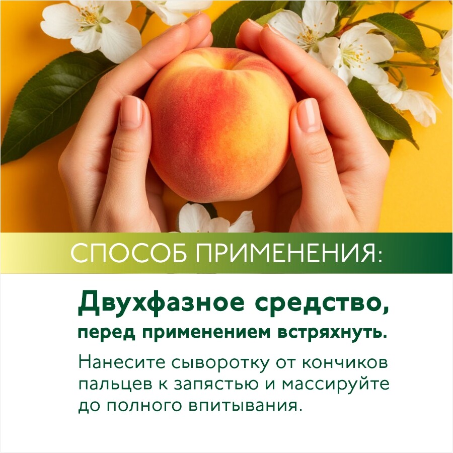 Нанесите сыворотку от кончиков пальцев к запястью и массируйте до полного впитывания.