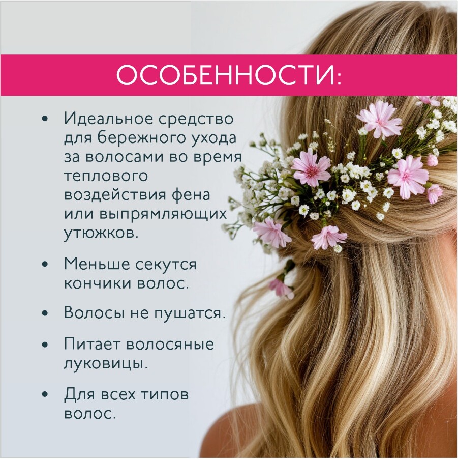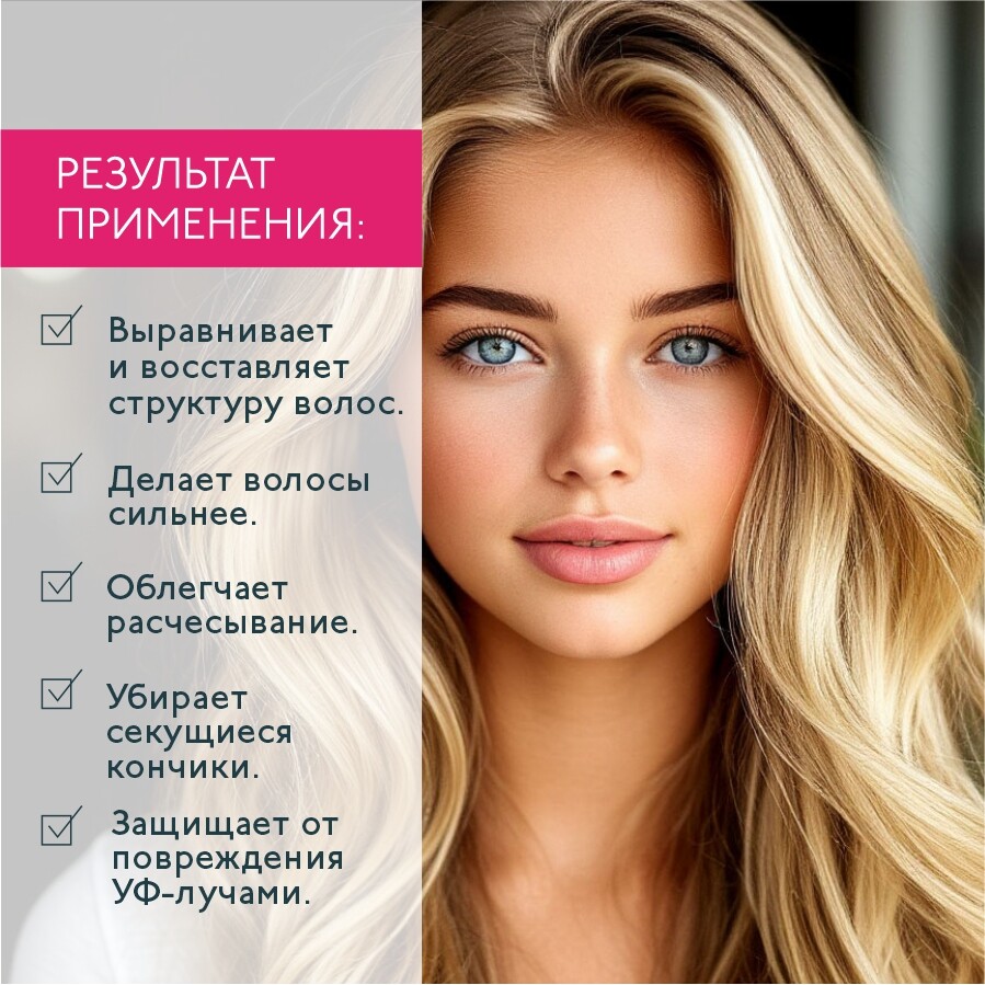 При регулярном использовании он делает волосы сильнее, восстанавливает их структуру, отлично выравнивает и облегчает расчесывание. Кончики меньше секутся, волосы не пушатся, становятся шелковистыми и излучают жизненную силу.
