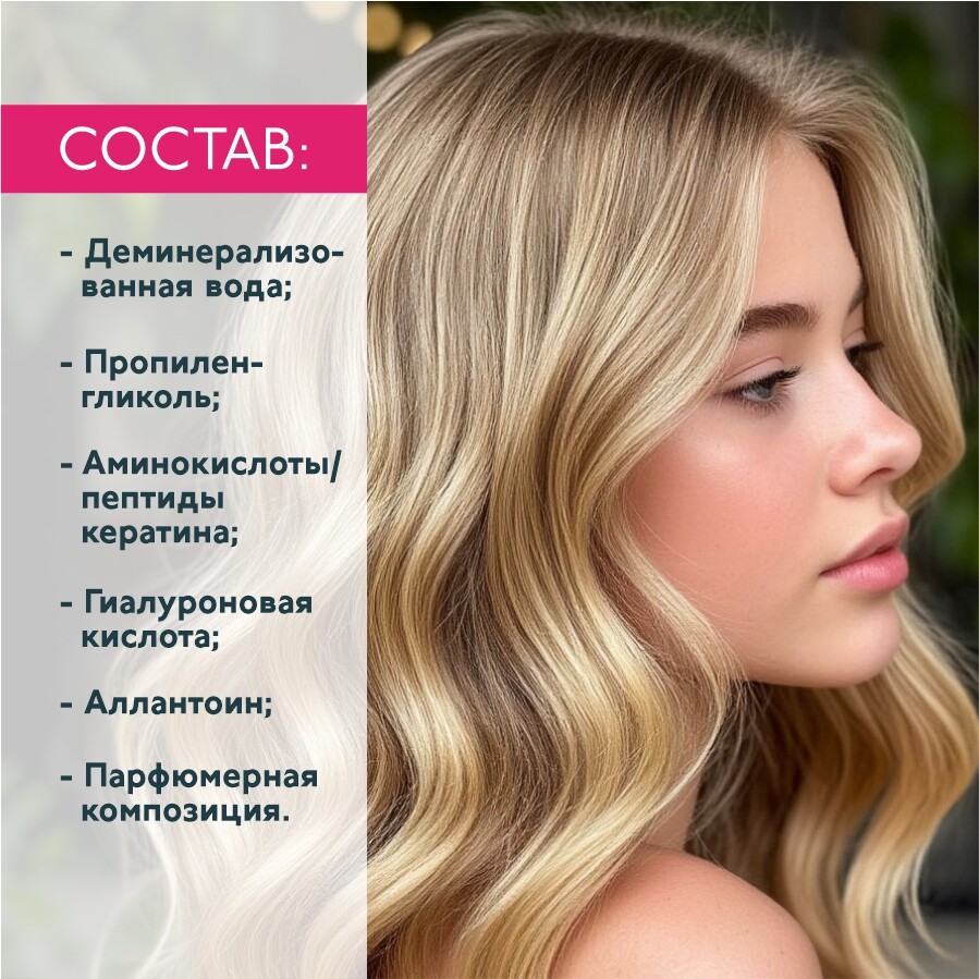Деминерализованная вода, пропиленгликоль, аминокислоты/пептиды кератина, гиалуроновая кислота, аллантоин, парфюмерная композиция.