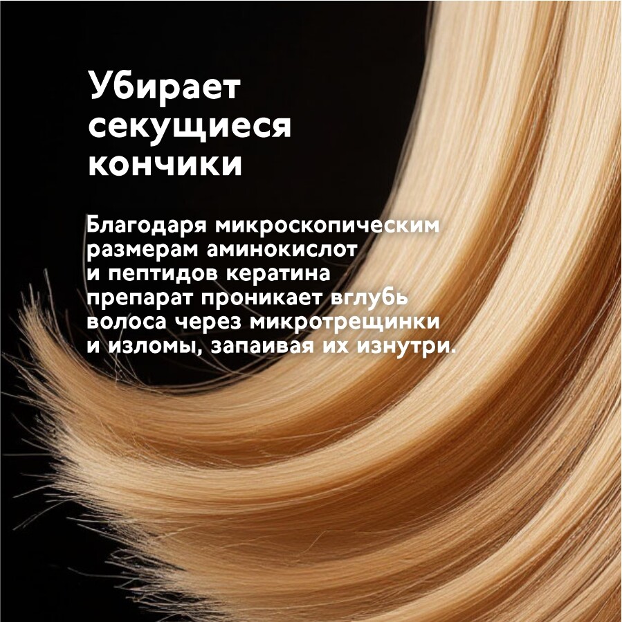 Благодаря микроскопическим размерам аминокислот и пептидов кератина препарат проникает вглубь волоса через микротрещинки и изломы, запаивая их изнутри. Гиалуроновая кислота способствует более длительному сохранению влаги. Аллантоин защищает от повреждения УФ - лучами. Для всех типов волос.