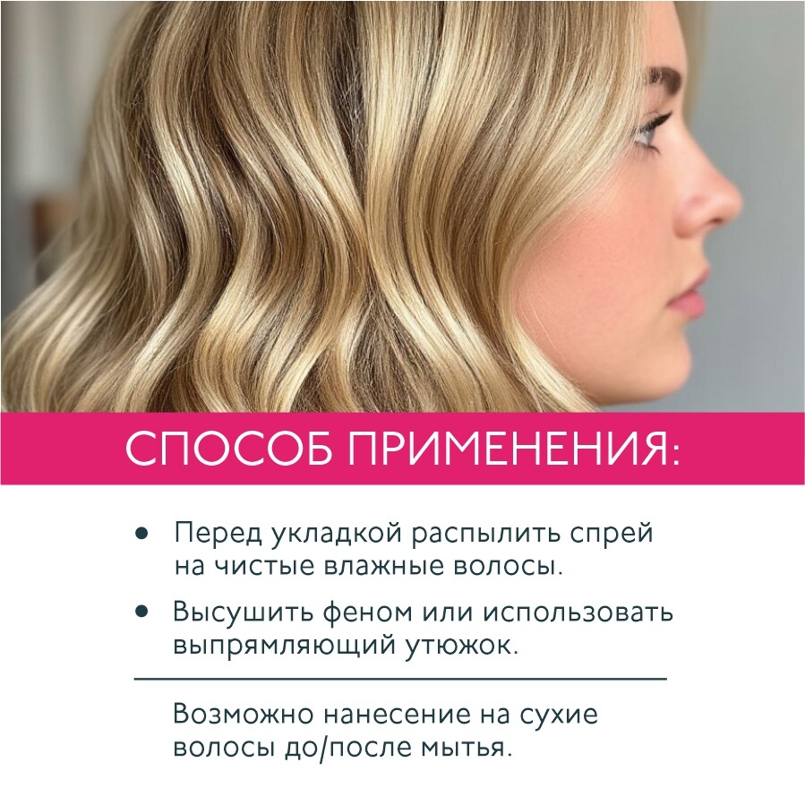Перед укладкой распылить спрей на чистые влажные волосы, высушить феном или использовать выпрямляющий утюжок. Возможно нанесение на сухие волосы до/после мытья.