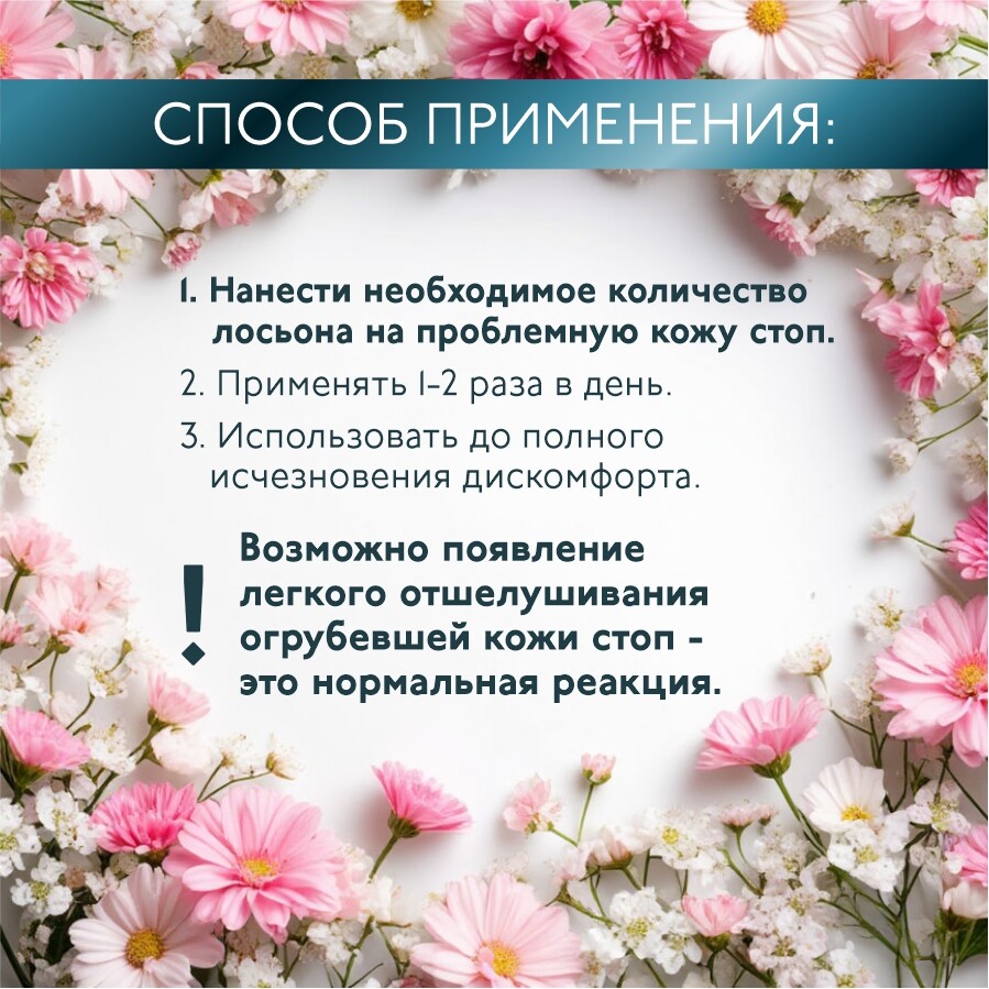 Возможно появление легкого отшелушивания огрубевшей кожи стоп - это нормальная реакция.