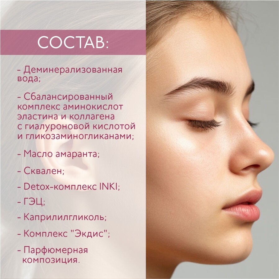 Деминерализованная вода, сбалансированный комплекс аминокислот эластина и коллагена с гиалуроновой кислотой и гликозаминогликанами, масло амаранта (Amaranthus), сквален, detox-комплекс INKI, гэц, каприлилгликоль, Экдис, парфюмерная композиция.