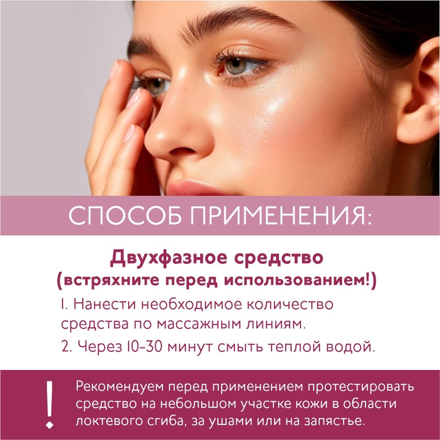 Нанести необходимое количество средства по массажным линиям. Через 10-30 минут смыть теплой водой. Двухфазное средство, встряхните перед использованием.